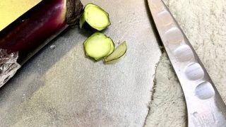 包丁を研いだあと、ナスのヘタで試し切りの図。