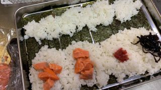 大きめの具で小さめおにぎり – 角バットぺたん式 –