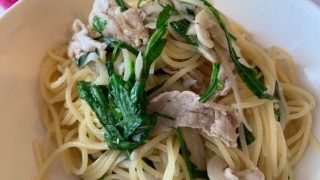 豚肉の薄切りとルッコラセルバチカとごぼうのパスタ